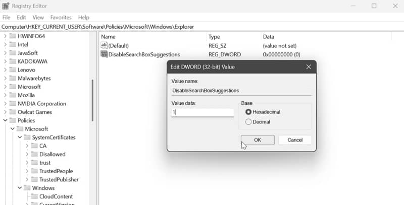 - In the Explorer folder, right-click and select New > DWORD (32-bit) Value. Name it DisableSearchBoxSuggestions.