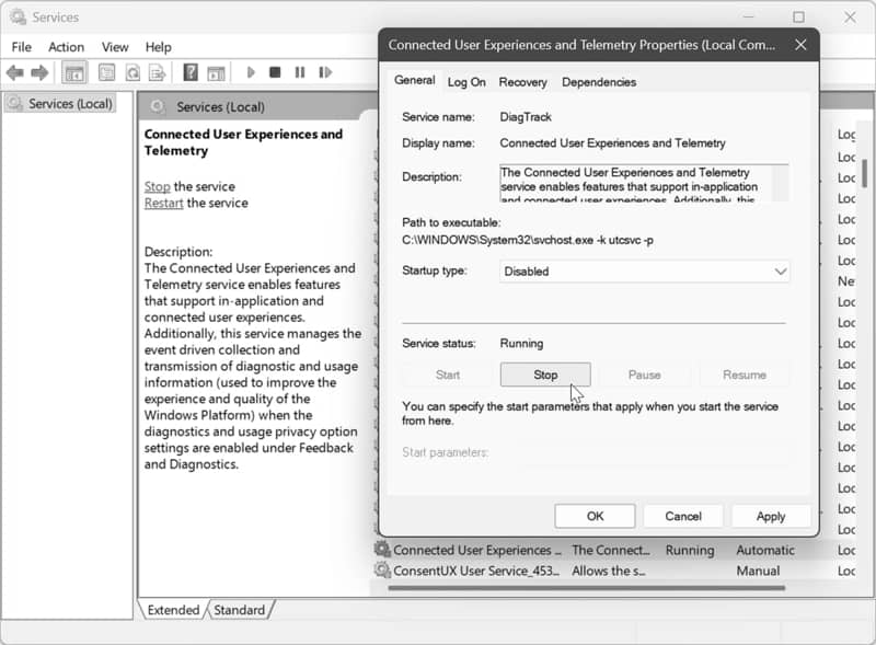 Your next stop is Windows Services. Specifically, you'll want to disable Connected User Experiences and Telemetry, since this function runs in the background.