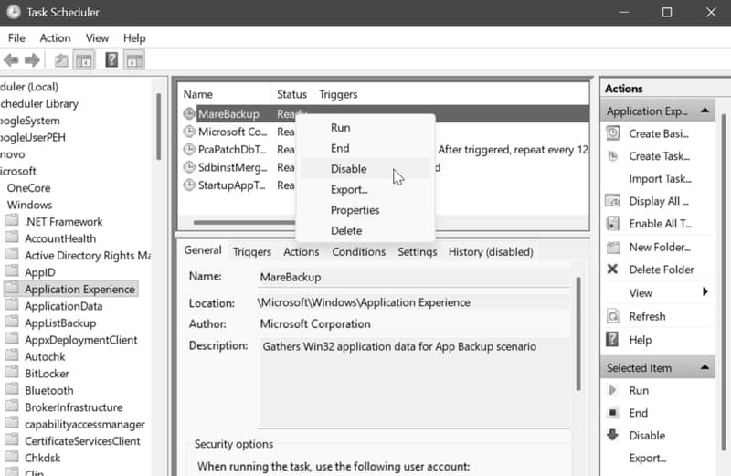 - From the Task Scheduler Library on the left, go to Microsoft\Windows\Application Experience.