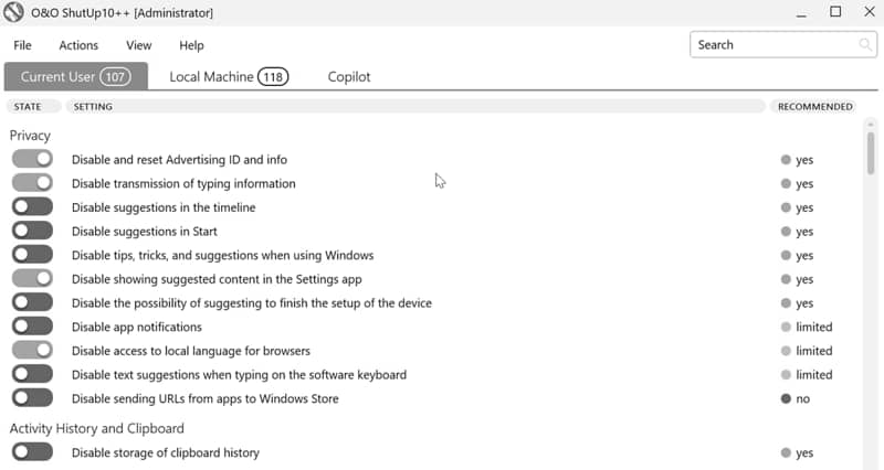Alternatively, you can skip the previous steps and disable all the problematic settings from one place with O&O ShutUp10++. It covers telemetry sharing, app permissions, location services, and more.