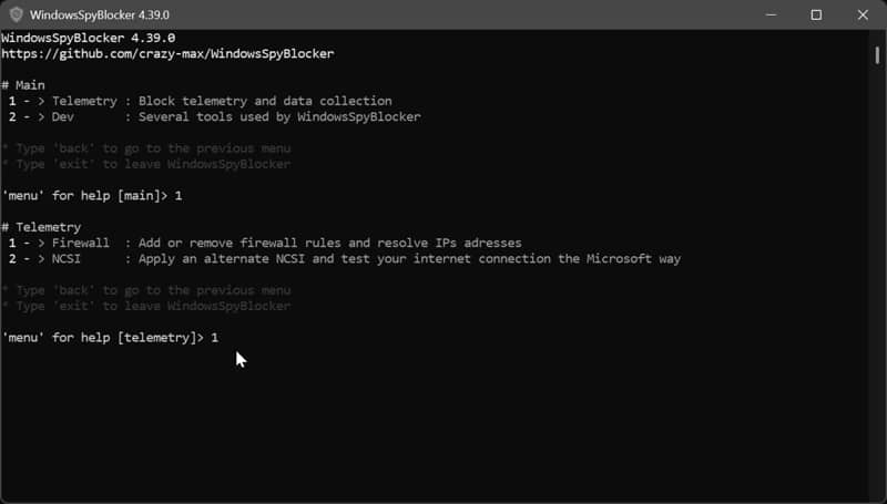 Once you download it, you can add or remove firewall rules. Simply type 1 in the interface to add a list of spy rules, and you're done.