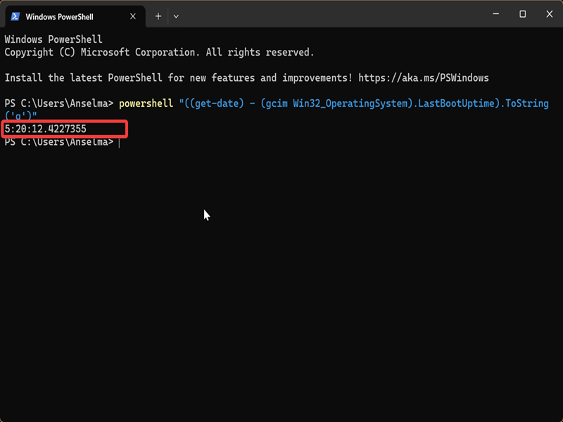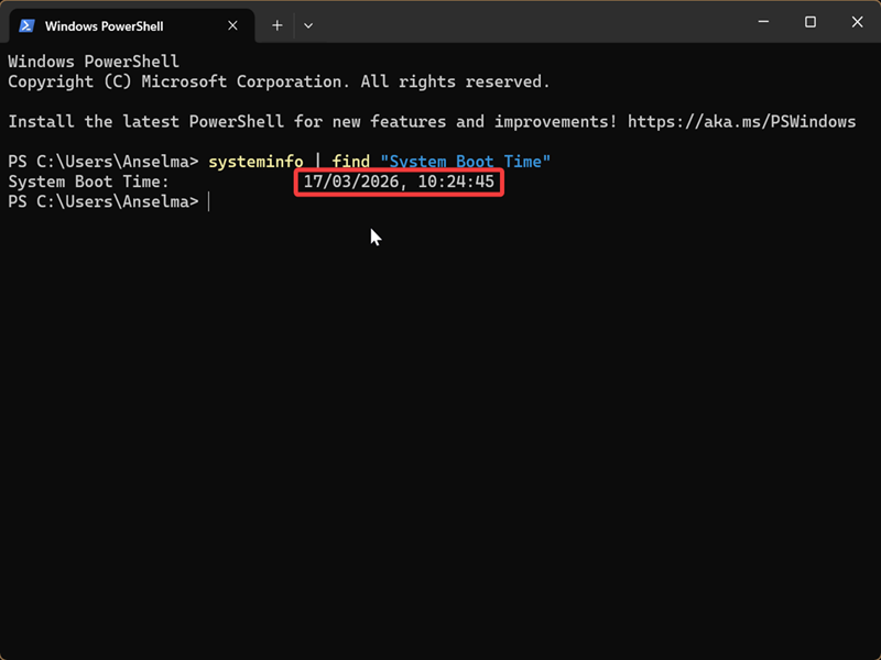 - Type the following command and press Enter: powershell "(get-date) - (gcim Win32_OperatingSystem).LastBootUpTime"