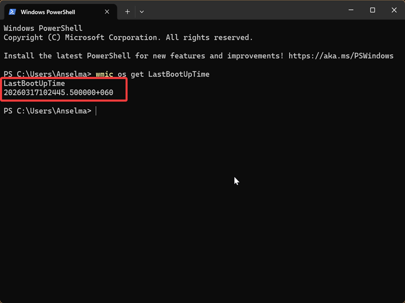 - Type the following command and press Enter: wmic os get LastBootUpTime