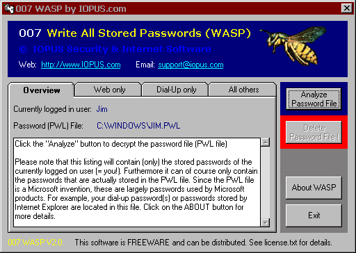 123 Write All Stored Passwords (WASP) allows the supervision / convenient deletion of this file to improve the security/privacy of your PC. It is also very useful for educational purposes about computer security. In the documentation you also find helpful facts about the Microsoft PWL file in general.