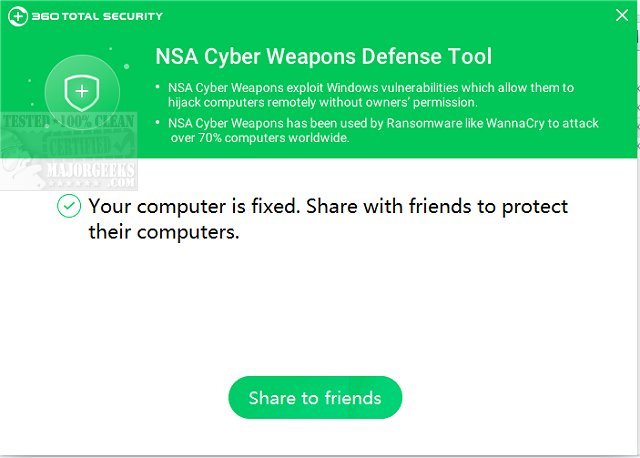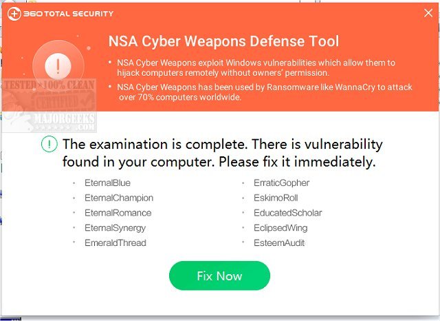 360 NSA Cyber Weapons Defense Tool was designed as a defense against the in-the-wild NSA tools that utilize outdated Windows system exploits to lock up vulnerable PCs.