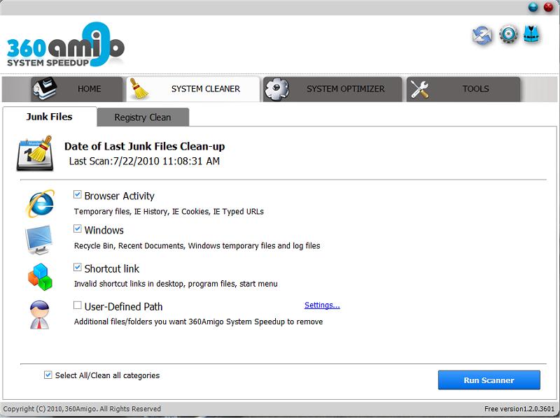360Amigo System Speedup Free is a new PC optimization and Error repair utility that dramatically improves the performance of your PC. 360Amigo System Speedup includes a System Cleaner, a System Optimizer and a wide range of System Tools designed exclusively to boost PC performance.
