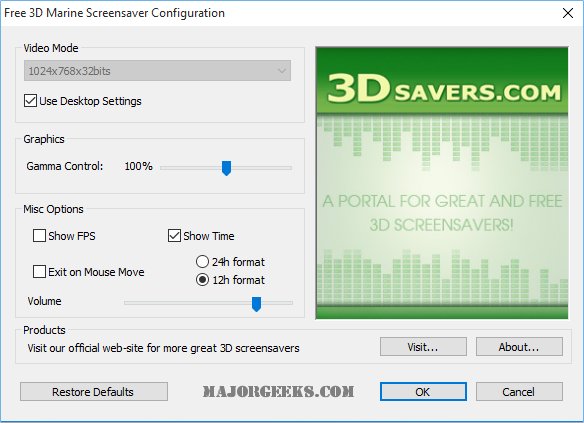 There are a lot of options for a screensaver of this age. By default, it will try to use your desktop settings, but you can adjust the gamma, so it is brighter or darker. You can see a clock in 2 different formats, show FPS and opt to exit on mouse movement. By default hitting any key or mouse click will exit. Volume control is included, and the sound is just a piano.