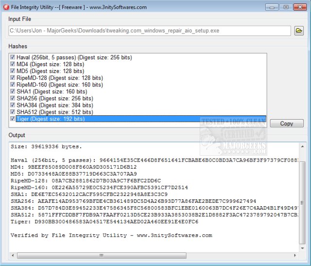 3nity File Integrity Utility will hash and verify Files through various secure algorithms: Haval 256, MD4, MD5, RipeMD-128, RipeMd-160, SHA1, SHA256, SHA384, SHA512, Tiger.