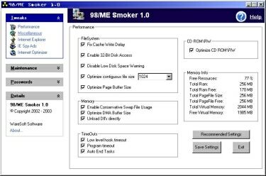 98/ME Smoker is a Windows 98 and Windows ME tweaking utility that will help to reduce system bottlenecks, decrease boot times and increase system stability.