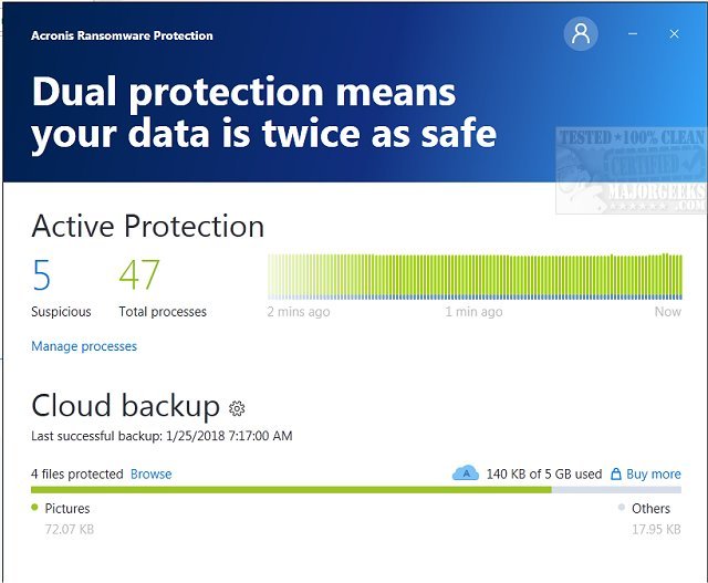 After Acronis Ransomware Protection has blocked a ransomware attack, it then assists you to restore the files that were altered or infected by searching for the latest file versions and then recovering clean copies from your backup, cache, or temporary files. It includes 5GB of free cloud backup that can be used during an attack or for protection against accidental deletions, disk failure, etc.