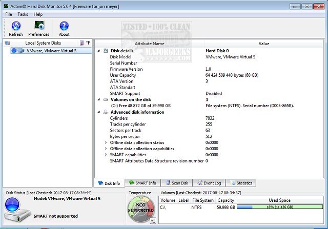 Active@ Hard Disk Monitor also provides you with details about your machine like PC name, disk model/serial number, file system, capacity, IP address, how many bytes per sector, and the S.M.A.R.T. data. This data can be saved to a TXT file and can also be automatically sent via e-mail or a pop-up notification if any critical conditions arise. It can also be used from remote computers in a local or global network.