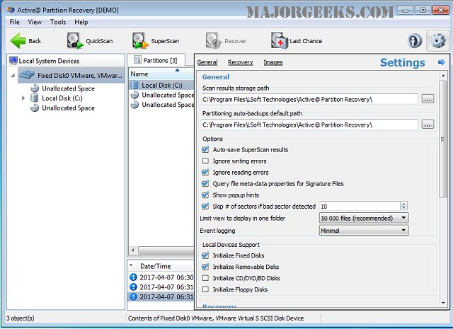 Using the QuickScan option will quickly detect and recover recently deleted partitions, as long as they were not formatted/overwritten to after deletion. For a more advanced low-level scan, use SuperScan to detect partitions that were deleted a long time ago, even if you have created new ones and even formatted them. The LastChance recovery method is as the name states; it detects and recovers files by their signatures on volumes having severely damaged file systems, where physical volume recovery isn't possible.