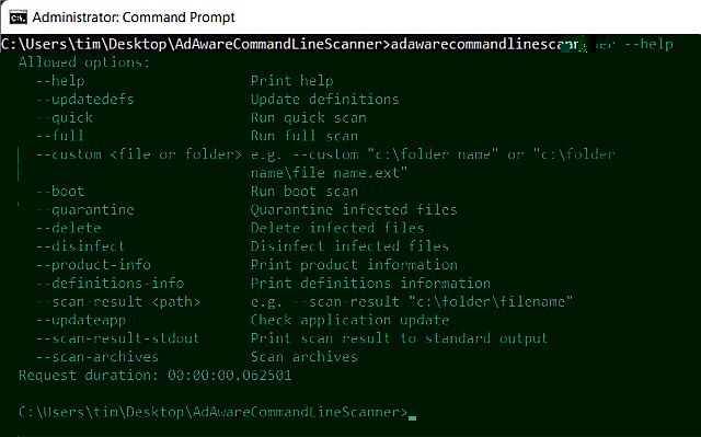 You will need to be familiar with the basics of PowerShell or the Command Prompt. Once extracted, type in adawarecommandlinescanner --help for a list of commands.