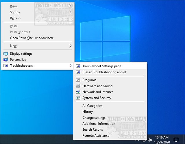 Add Troubleshooters Context Menu in Windows 10 allows easy access to the various Windows 10 troubleshooters directly from the right-click context menu.