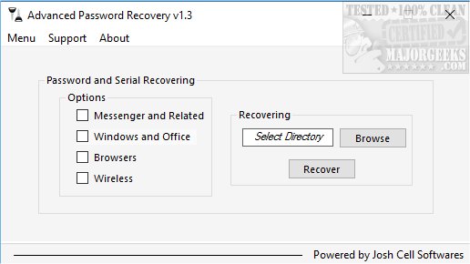 "Recovering Passwords" allows you to try and recover passwords from Messenger and Related, Windows and Office, Browsers, and Wireless. You need to select a folder to attempt recovery. It will save a file with the proper name of what you were looking for (Windows Serials.txt, Wireless Passwords.txt) in the folder you selected. It seems easiest just to select C: drive because we found it to be fast and it did retrieve the product keys we specified.