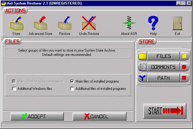 Aid System Restorer is a very configurable tool, so advanced users may tune it for their needs. It allows you to store not only the system state but all installed software information too. Also, you may manually select files you are interested in storing.
