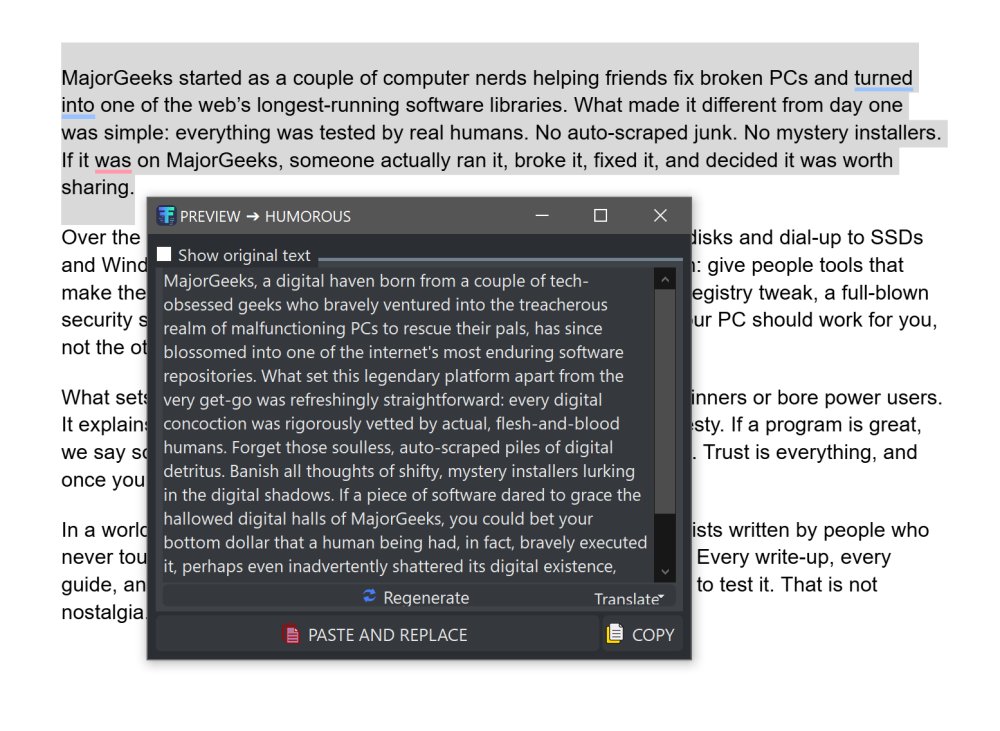 AITextTune isn't trying to be a full AI writing suite, which is why it's actually useful. It fixes text as you type, then gets out of the way. If you write all day and want cleaner sentences without bouncing between apps it's handy as hell. It has different tools and uses to make your life easier, but be wary. AI writing can save time with some basic stuff, but though theout put can look original enough to pass a glance test, you can end up with something that sounds both confident and wrong while being oddly generic at the same time. Make sure you proofread everything and never use something like this as "original work" like a school paper.