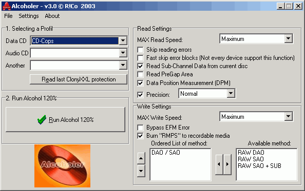 Alcoholer will set right settings in Alcohol 120%, CloneCD and BlindWrite for each protection.