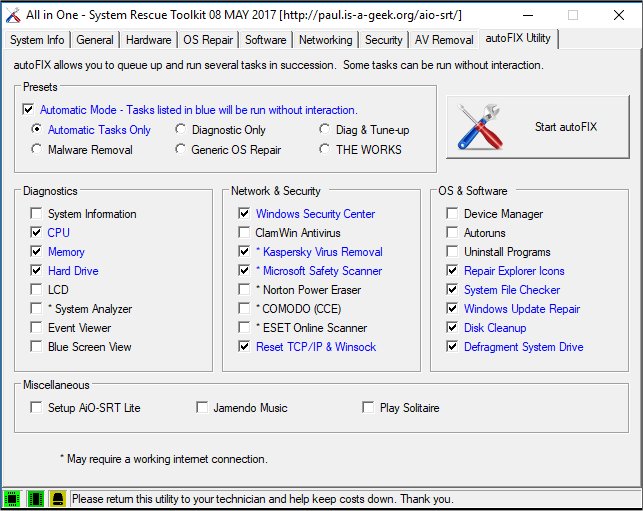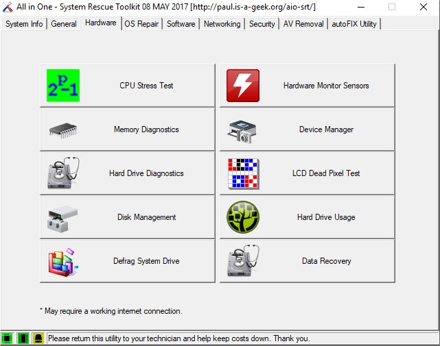 When the AiO-SRT CD or USB is inserted into a Windows computer, the program AiO-SRT.exe can be run and contains the following utilities: