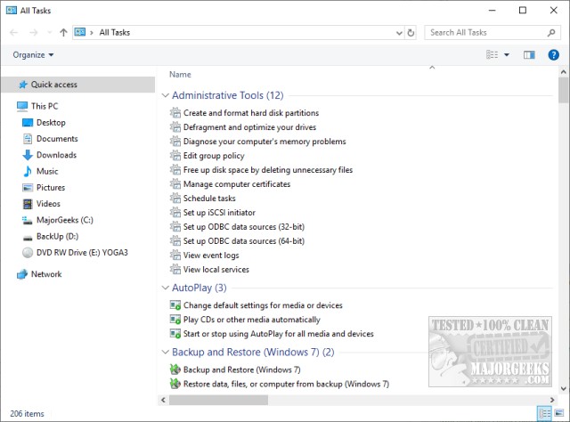 All Tasks has one goal in mind, to create a shortcut to all the God Mode settings on your Taskbar, or a toolbar. MajorGeeks will have a step-by-step guide on how to create these shortcuts soon.