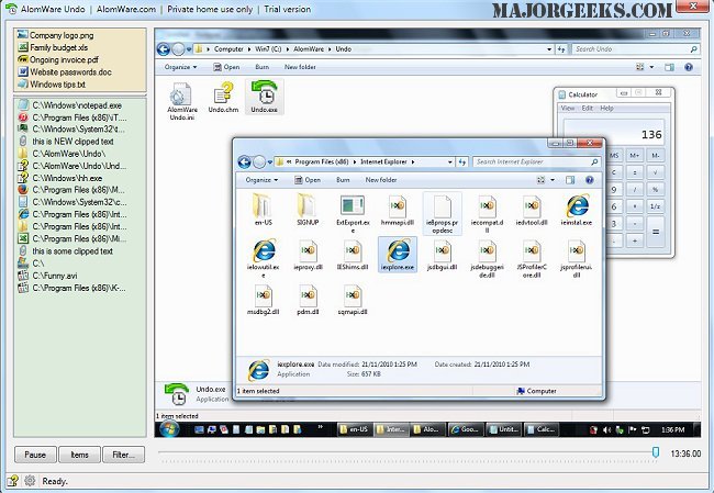 See everything that happened on your PC for the last two hours. Got a bad memory? What did that tech support guy say in that now-closed chat window? Or did you modify a document and can't remember what was written before? Just time-travel back and look! AlomWare Undo shows your desktop again, so you can use your PC with the confidence of always knowing exactly what you did.