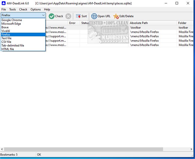 Starting with AM-DeadLink 4.7, it's no longer possible to change or delete bookmarks from your Internet Browser. Browser bookmarks should only be deleted within the browser user interface, not via external tools.