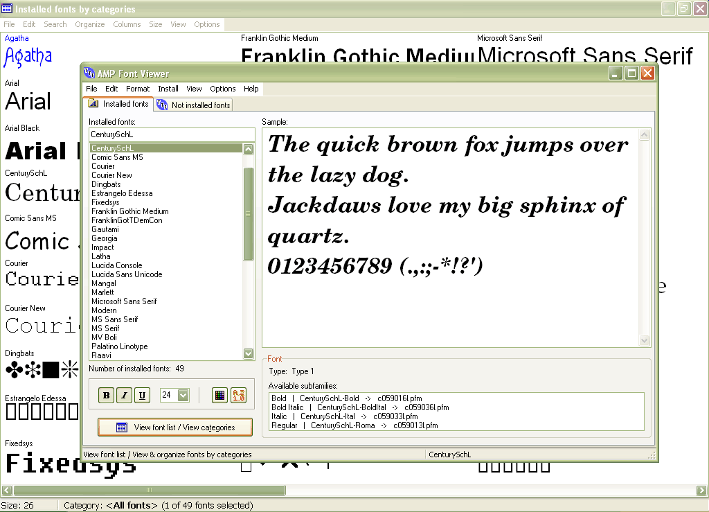 This program is an easy to use but powerful font manager, which allows getting a quick overview of both installed and non installed fonts. It can install and uninstall fonts, and organize them in categories.