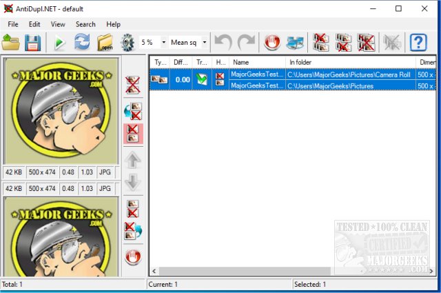 AntiDupl can find and display duplicate images in the main graphics formats: JPEG, GIF, TIFF, BMP, PNG, EMF, WMF, EXIF, ICON, JP2, and PSD.