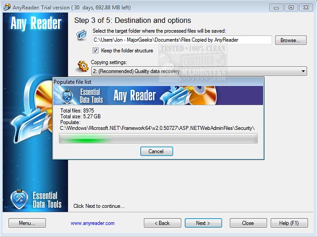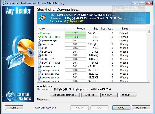 AnyReader is great for copying files from scratched CD/DVDs or defective floppy/hard disks. Normally when your computer is unable to copy files from a damaged disk it will abort and delete the part of the file it has copied. AnyReader will continue copying the file right to the end; any data that hasn't been recovered after several retries are replaced with blanks.