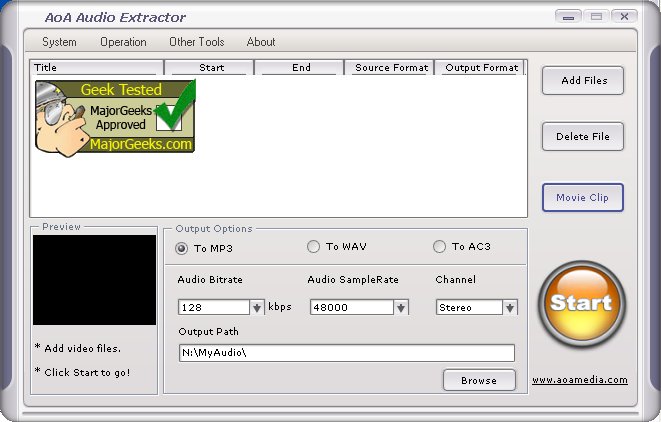 With AoA Audio Extractor, you can easily extract audio tracks from AVI, MPEG, MPG, FLV (Flash Video), DAT, WMV, MOV, MP4, 3GP video files and save them as MP3, WAV and AC3 formats.