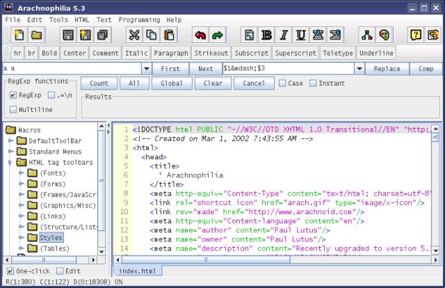 It supports up to 6 Web browsers, switches between them in a flash. Arachnophilia offers the development of HTML, frames, CGI, Perl, C++, Java, and Javascript with many intelligent tools and functions, as well as a built-in intelligent FTP client that automatically uploads changed files to your server.
