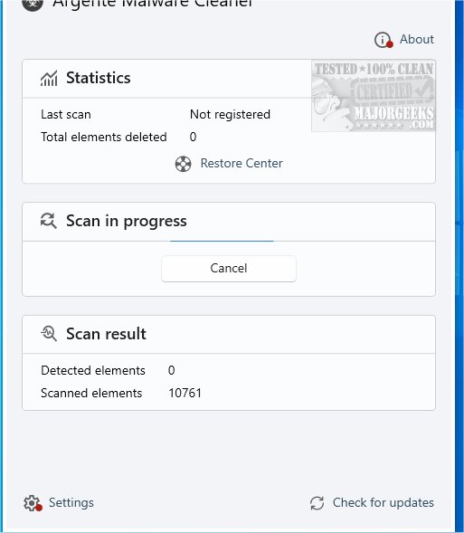 Argente Malware Cleaner lets you easily initiate a scan of the local system by simply clicking a button. During the scanning process, the application displays statistics on the elements scanned and the number of detections made, enabling you to effectively monitor the cleanup process.