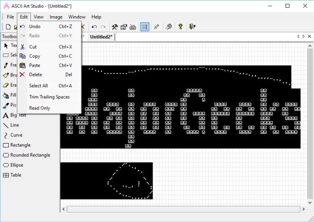 Creating ASCII art is pretty simple to do, and ASCII Art Studio takes it to an entirely new level. You can select from numerous ways to create your art in the toolbox. These include text mode, selection, freehand, brush, erase, fill, pickup, big text, line, curve, rectangle, rounded rectangle, ellipse, and table.