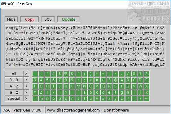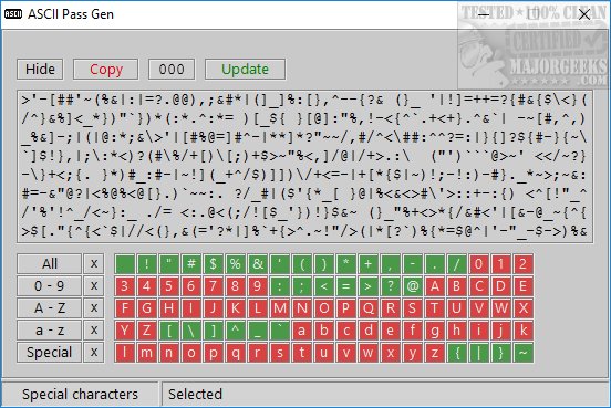 ASCII Pass Gen is portable and on startup displays a random, really long password. You won't remember that one! You have the option to show or hide the password, copy it, and should you change the rules, an update button to apply the changes. Highlight any password currently on the screen, and it will tell you how many characters are used, although it would seem better if the program kept track of how many characters you're using as you go or allowed you to set the number of characters as a defining rule. You have to highlight whatever characters you're using to copy them. After all, it's using 512 characters every time, and I don't know anyone using 512 character passwords. Not that that's a bad thing, you can create some truly complex, random passwords this way.