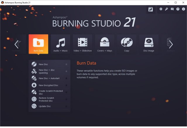 Ashampoo Burning Studio boasts a new powerful navigation interface that, instead of a standard menu, features a carousel that smoothly takes you from one program section to the next. Detailed feature descriptions now make it easier than ever before to find what you're looking for, and the new favorites bar gives you instant access to your favorite features. And to top it all off, there is now a home button that takes you right back to the start page, no matter where you are. Don't like what you see? Hit a switch, and you're back to the traditional Burning Studio menu style.