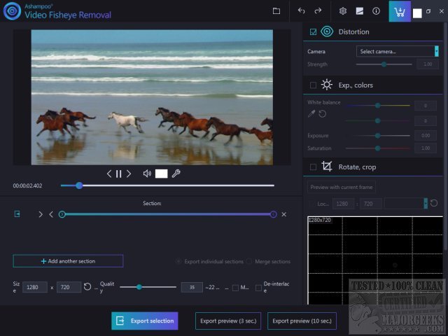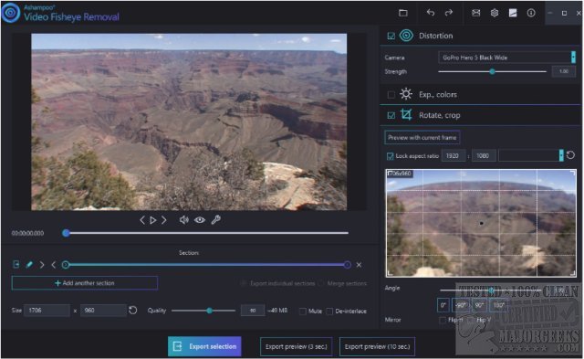 It is compatible with over 50 action cam presets (GoPro, Mobius ActionCam, Rollei, Sony, and many others) and will provide instant lens correction at the click of a button. Ashampoo Fisheye Removal includes a built-in live preview allowing for precise manual adjustments to white balance, exposure, and colors. In addition to that, it is also capable of rotating (90°, 180°, 270°, custom) or mirroring your videos and can easily save them to most popular formats. Cropping is also supported allowing you to fine-tune your video to the dimensions you desire.