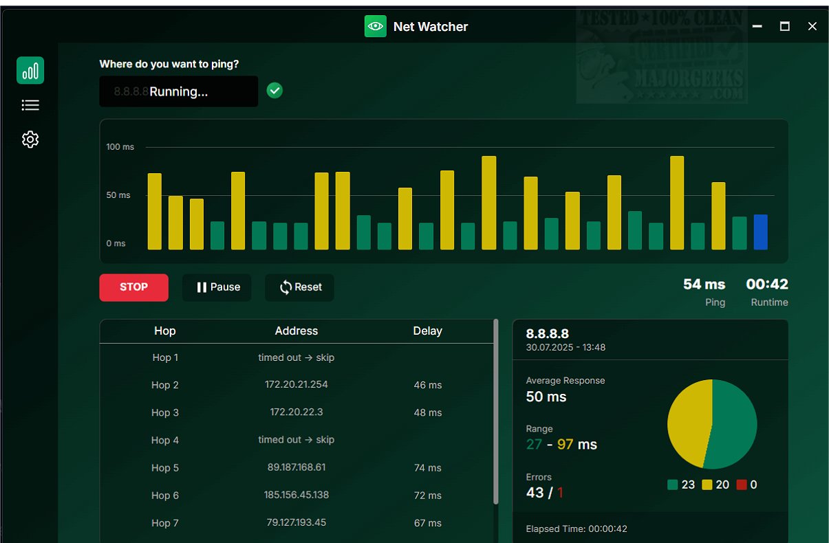 Furthermore, Ashampoo Net Watcher meticulously displays the exact route, often referred to as "hops," that your connection takes to reach the intended target server. This invaluable information enables you to quickly ascertain where the issue lies, whether it's within your own home network, with your Internet Service Provider (ISP), or somewhere along the route to the destination server. With such detailed insights, Net Watcher becomes the ideal tool for collecting concrete evidence when communicating with your provider, as well as for gaining a deeper understanding of your own network’s performance.
