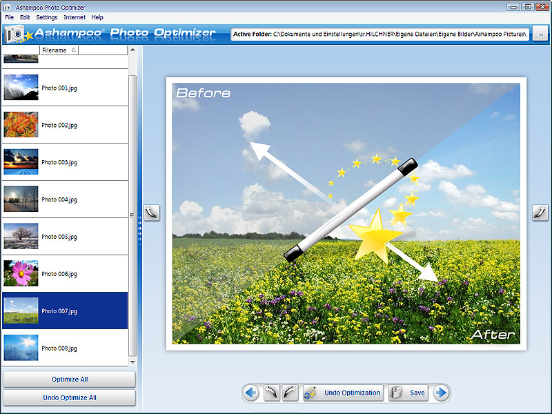 In this way the Ashampoo Photo Optimizer is really a world sensation, which every user with a digital camera almost imperatively needs. The programme opens individual pictures and shows them in its window. A single click of the mouse is enough to optimize the photo entirely. The effect of this optimization does not fail to impress. The photos changed by the Ashampoo Photo Optimizer are livelier, brighter, lighter, sharper and have a stronger contrast. The direct before and after comparison shows precisely just how strong the optimization algorithm of the software is.