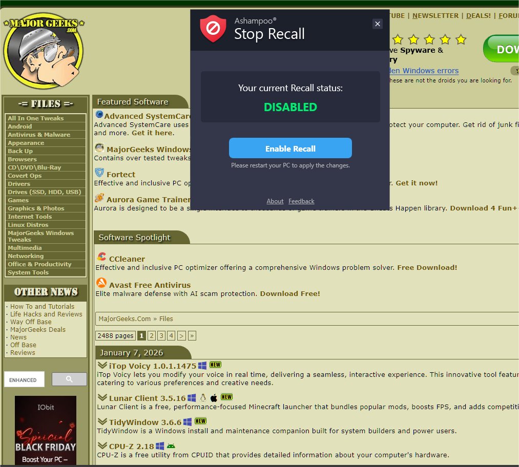 Ashampoo Stop Recall is an easy-to-use tool that lets you disable Microsoft's privacy-related Recall feature with a single click. Users who want to manage data collection appreciate its simplicity and effectiveness. However, during our tests, we sought feedback, and some users expressed concerns that it might not completely stop screen capture activity (metrics not readily available during a short testing process). This may make it a good option for quickly turning the feature on or off, but potentially may not ensure complete removal in every case.