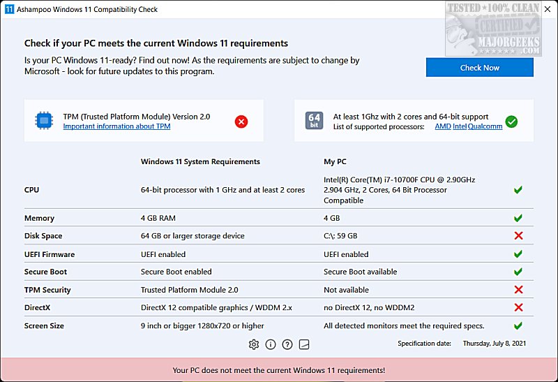 Once installed, click Check Now and wait a few seconds. Ashampoo Windows 11 Compatibility Check will check for and let you know if you meet the requirements, including: