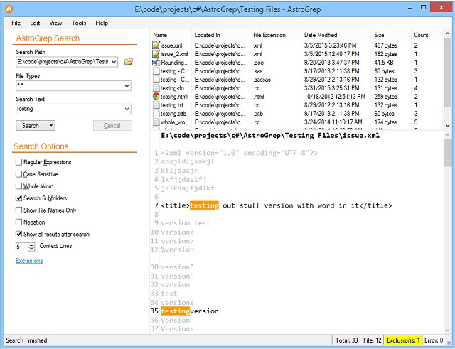 AstroGrep is a portable tool that offers more flexibility in searching than the default Windows search - it includes valuable features such as regular expressions, flexible printing options, and stores the most recently used paths. It has a "context" feature for quickly viewing source codes.