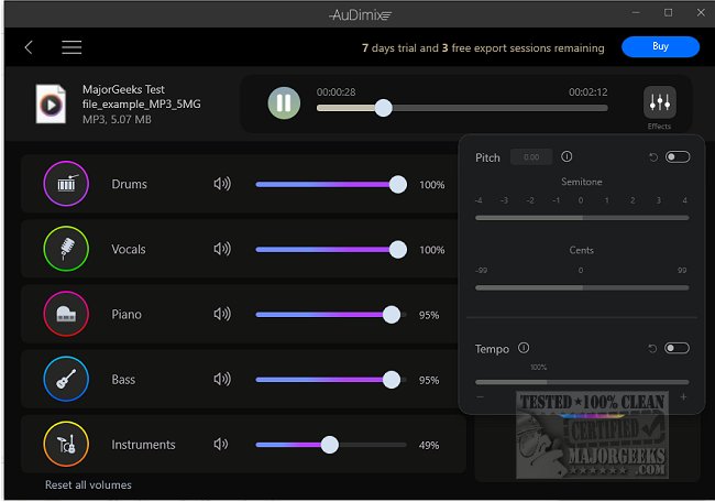 AuDimix lets you separate up to five different parts of a music track. You can split the vocals, drums, bass, piano, and backing instruments using it, and it works with different audio formats. With AuDimix, you can create your own remixes, mashups, covers, and backing tracks. You can tweak the pitch, tempo, and volume of each part independently. AuDimix allows you to preview your mashups and remixes in real time. Once you are happy with the result, you can mix and export the parts as high-quality audio files.