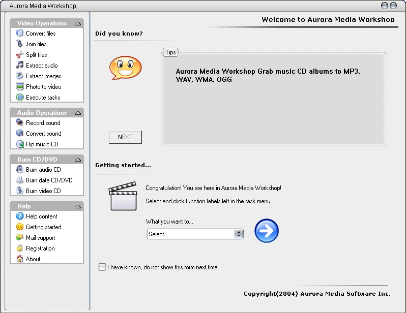 Aurora Media Workshop is a program that includes professional features in Video, Audio, and Compact Disc media. It is a video converter, joiner, splitter; audio cd ripper, converter, recorder; video, audio, date cd burner.