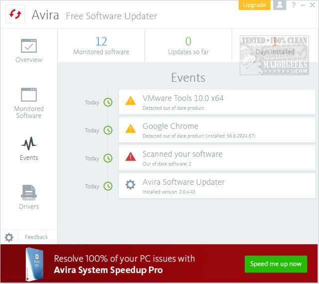 The monitored software tab shows you everything being monitored but is borderline pointless because you can't disable software updates. The Events tabs will show everything updated, when you last scanned and what needs updating. It also lists the number of monitored software, updates so far, and days installed. Frankly, Monitored Software and Events could be combined into one tab.