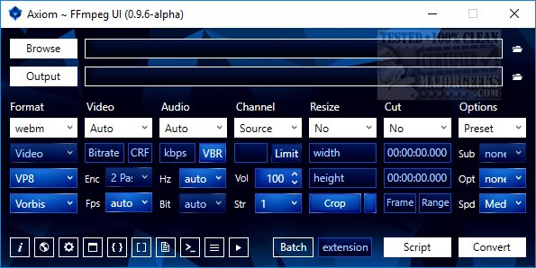 Axiom makes it simple to use all of the features available. Browse to the file you want to open and choose where to output it. Drop down boxes give you quick access all the preset formats, video, audio, channel, resize, cut, and more. Under each of those drop-down boxes are other options so that you can work from left to right and get everything how you like it and convert. Optionally, you can play the converted file to make sure you're happy.