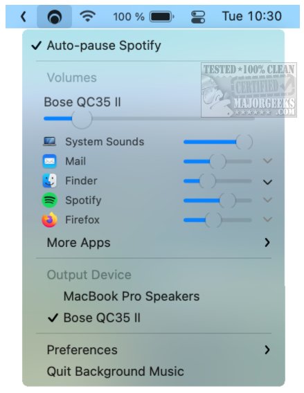 Background Music automatically pauses your music player when a second audio source plays and unpauses the player when the second source has stopped.