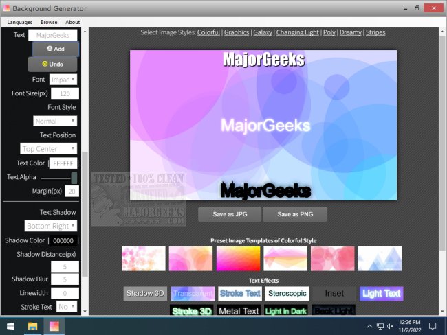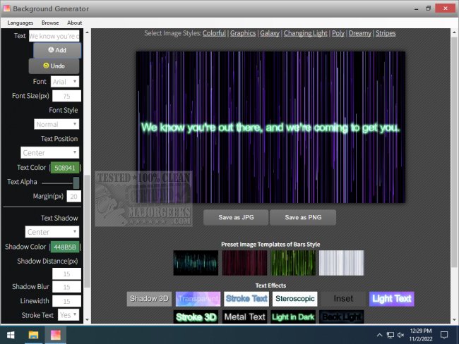 Background Generator is also capable of adding text onto the created image. So, if you want to add text or a statement to your background, you can easily add different effects like blur, shadow, lights, etc. Background Generator has several image example presets/templates and text effects for each image style.