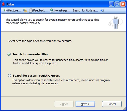 Baku allows you to search for system registry errors and unneeded files that can be safely removed.
