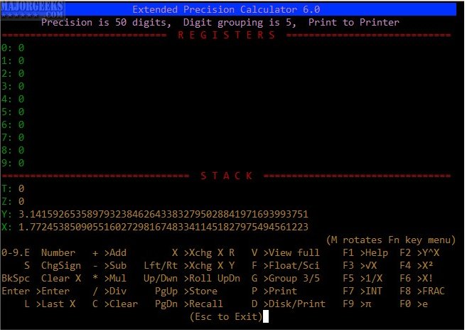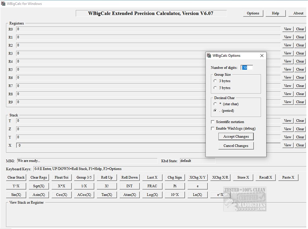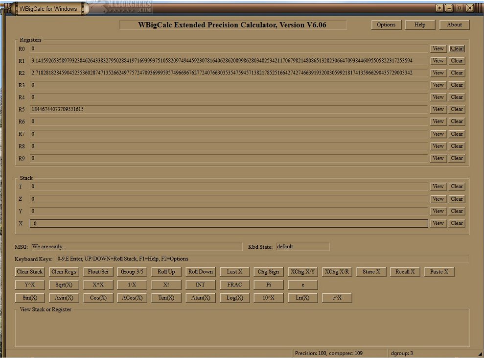 WBigCalc has +, -, x, ÷, vX, X², X!, Y^X, logs, trig, pi, e, print, and more. All trigonometric functions are based on radians. WBigCalc is efficient, but calculations for some large numbers may take several minutes to complete. If a calculation takes too long, you can abort it by pressing the Escape key. For on-screen assistance, press F1. You can view registers fully, print them to a printer, or save them to disk.