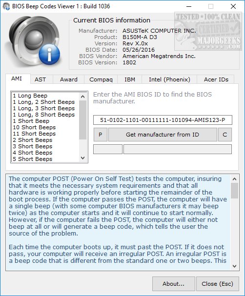 You can either enter the BIOS ID or chose from AMI, AST, Award, Compaq, IBM, Intel (Phoenix), or Acer IDs. Because beep codes vary from BIOS to BIOS, this makes it very simple to determine what BIOS you have or even guess if you're not sure. Some BIOS, including Intel, can vary and be complicated.